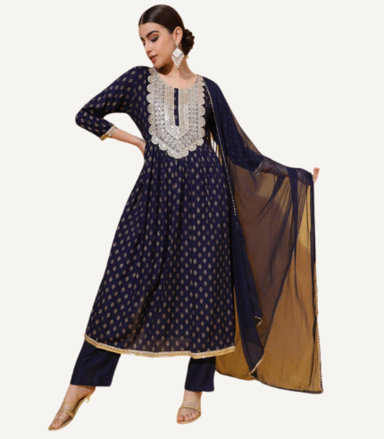 Elevate your festive and ethnic wardrobe with this exquisitely designed Kurta, Pant & Dupatta set crafted from luxurious Rayon Lurex fabric. Featuring intricate embroidery on the neckline and sleeves, this ensemble is a perfect fusion of elegance and comfort. The flowy silhouette and subtle shimmer of the fabric add a regal touch, making it ideal for special occasions and celebrations.