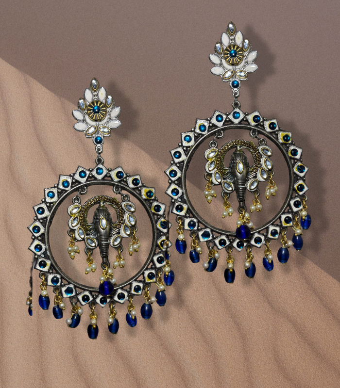 Elevate your accessory game with these stunning handmade earrings, featuring a bold circular design adorned with intricate mirror work and delicate bead hangings. The oxidized silver finish combined with royal blue and antique gold accents reflects traditional craftsmanship with a contemporary flair, making these earrings a true statement piece.