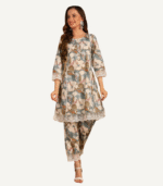 Crafted from premium-quality muslin fabric, this set features a graceful all-over foil print that adds a subtle shimmer to your look. The ensemble is elevated with delicate lace detailing on both the top and bottom hem, giving it a refined and feminine finish.